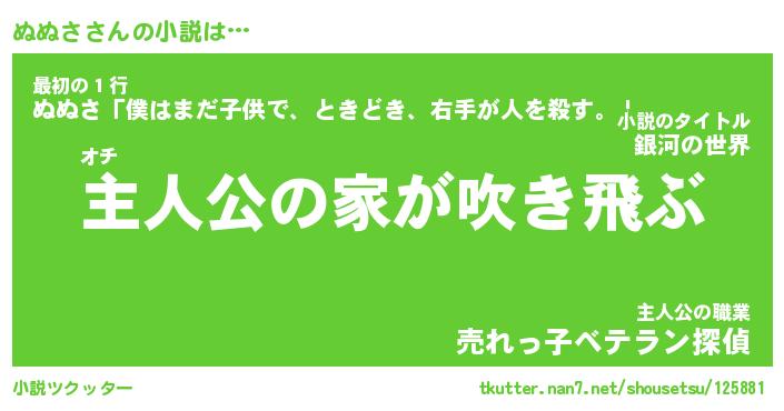 ぬぬささんの小説は… オチ『主人公の家が吹き飛ぶ』最初の1行『ぬぬさ「僕はまだ子供で、ときどき、右手が人を殺す。」』主人公の職業『売れっ子ベテラン探偵』 ツクッター #小説ツクッター http://tkutter.nan7.net/shousetsu/125881/