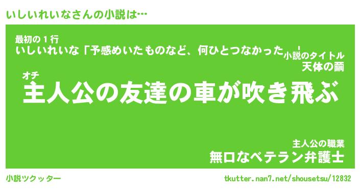 いしいれいなさんの小説は… オチ『主人公の友達の車が吹き飛ぶ』最初の1行『いしいれいな「予感めいたものなど、何ひとつなかった。」』主人公の職業『無口なベテラン弁護士』 ツクッター #小説ツクッター http://tkutter.nan7.net/shousetsu/12832/