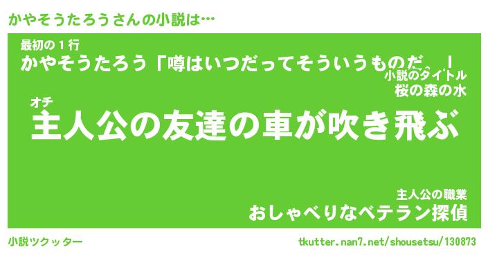 かやそうたろうさんの小説は… オチ『主人公の友達の車が吹き飛ぶ』最初の1行『かやそうたろう「噂はいつだってそういうものだ。」』主人公の職業『おしゃべりなベテラン探偵』 ツクッター #小説ツクッター http://tkutter.nan7.net/shousetsu/130873/