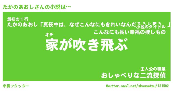 たかのあおしさんの小説は… オチ『家が吹き飛ぶ』最初の1行『たかのあおし「真夜中は、なぜこんなにもきれいなんだろうと思う。」』主人公の職業『おしゃべりな二流探偵』 ツクッター #小説ツクッター http://tkutter.nan7.net/shousetsu/131502/