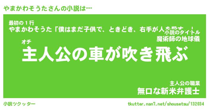 やまかわそうたさんの小説は… オチ『主人公の車が吹き飛ぶ』最初の1行『やまかわそうた「僕はまだ子供で、ときどき、右手が人を殺す。」』主人公の職業『無口な新米弁護士』 ツクッター #小説ツクッター http://tkutter.nan7.net/shousetsu/132034/