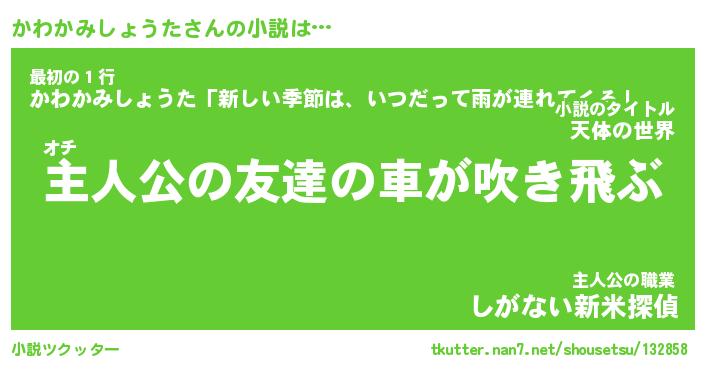 | 胡散臭い通販商品みたいなあだ名 | 『モテモテ間違いなし霊験あらたかなお札…その名も「かわかみしょうた」』 |