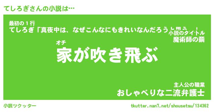 てしろぎさんの小説は… オチ『家が吹き飛ぶ』最初の1行『てしろぎ「真夜中は、なぜこんなにもきれいなんだろうと思う。」』主人公の職業『おしゃべりな二流弁護士』 ツクッター #小説ツクッター http://tkutter.nan7.net/shousetsu/134362/