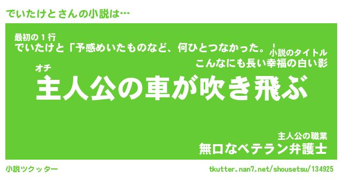 でいたけとさんの小説は… オチ『主人公の車が吹き飛ぶ』最初の1行『でいたけと「予感めいたものなど、何ひとつなかった。」』主人公の職業『無口なベテラン弁護士』 ツクッター #小説ツクッター http://tkutter.nan7.net/shousetsu/134925/