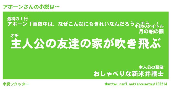アホーンさんの小説は… オチ『主人公の友達の家が吹き飛ぶ』最初の1行『アホーン「真夜中は、なぜこんなにもきれいなんだろうと思う。」』主人公の職業『おしゃべりな新米弁護士』 ツクッター #小説ツクッター http://tkutter.nan7.net/shousetsu/135214/
