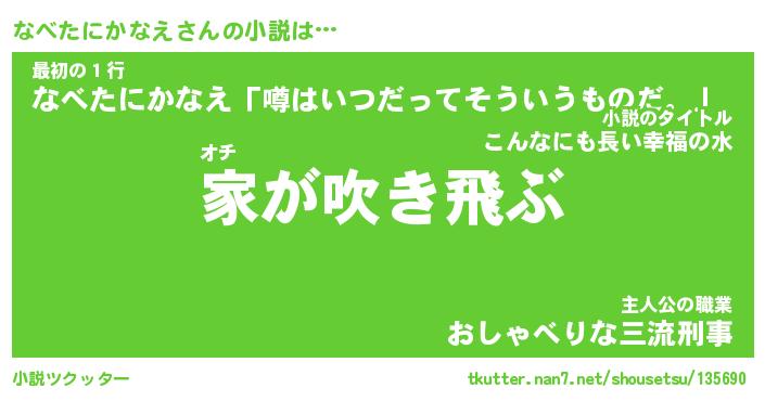なべたにかなえさんの小説は… オチ『家が吹き飛ぶ』最初の1行『なべたにかなえ「噂はいつだってそういうものだ。」』主人公の職業『おしゃべりな三流刑事』 ツクッター #小説ツクッター http://tkutter.nan7.net/shousetsu/135690/