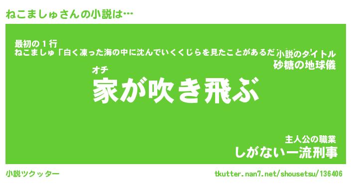 ねこましゅさんの小説は… オチ『家が吹き飛ぶ』最初の1行『ねこましゅ「白く凍った海の中に沈んでいくくじらを見たことがあるだろうか。」』主人公の職業『しがない一流刑事』 ツクッター #小説ツクッター http://tkutter.nan7.net/shousetsu/136406/