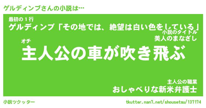 ゲルディンブさんの小説は… オチ『主人公の車が吹き飛ぶ』最初の1行『ゲルディンブ「その地では、絶望は白い色をしている」』主人公の職業『おしゃべりな新米弁護士』 ツクッター #小説ツクッター http://tkutter.nan7.net/shousetsu/137174/