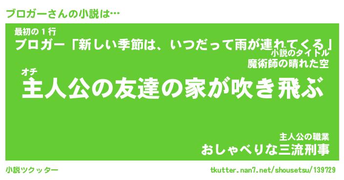 ブロガーさんの小説は… オチ『主人公の友達の家が吹き飛ぶ』最初の1行『ブロガー「新しい季節は、いつだって雨が連れてくる」』主人公の職業『おしゃべりな三流刑事』 ツクッター #小説ツクッター http://tkutter.nan7.net/shousetsu/139729/