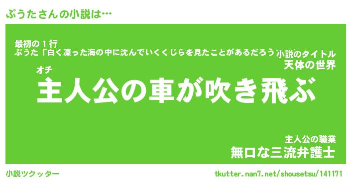 ぷうたさんの小説は… オチ『主人公の車が吹き飛ぶ』最初の1行『ぷうた「白く凍った海の中に沈んでいくくじらを見たことがあるだろうか。」』主人公の職業『無口な三流弁護士』 ツクッター #小説ツクッター http://tkutter.nan7.net/shousetsu/141171/