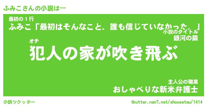 ふみこさんの小説は… オチ『犯人の家が吹き飛ぶ』最初の1行『ふみこ「最初はそんなこと、誰も信じていなかった。」』主人公の職業『おしゃべりな新米弁護士』 ツクッター #小説ツクッター http://tkutter.nan7.net/shousetsu/1414/