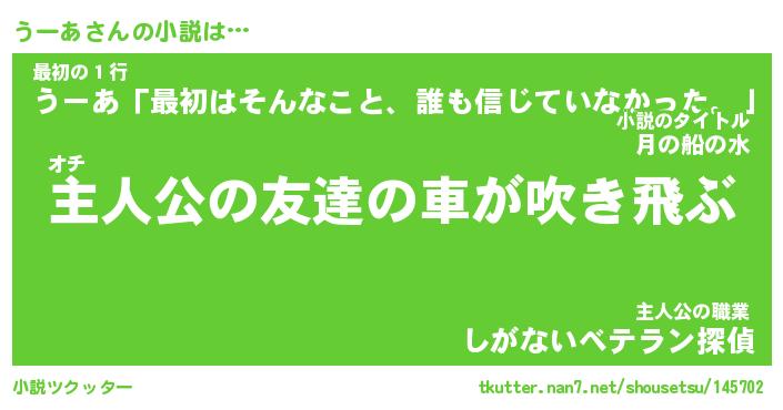 うーあさんの小説は… オチ『主人公の友達の車が吹き飛ぶ』最初の1行『うーあ「最初はそんなこと、誰も信じていなかった。」』主人公の職業『しがないベテラン探偵』 ツクッター #小説ツクッター http://tkutter.nan7.net/shousetsu/145702/
