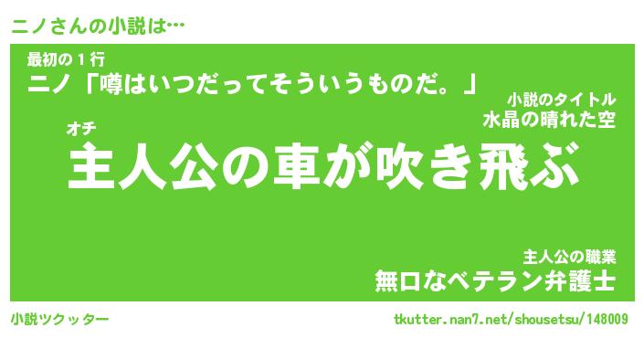 ニノさんの小説は… オチ『主人公の車が吹き飛ぶ』最初の1行『ニノ「噂はいつだってそういうものだ。」』主人公の職業『無口なベテラン弁護士』 ツクッター #小説ツクッター http://tkutter.nan7.net/shousetsu/148009/