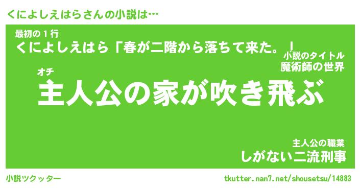 くによしえはらさんの小説は… オチ『主人公の家が吹き飛ぶ』最初の1行『くによしえはら「春が二階から落ちて来た。」』主人公の職業『しがない二流刑事』 ツクッター #小説ツクッター http://tkutter.nan7.net/shousetsu/14883/