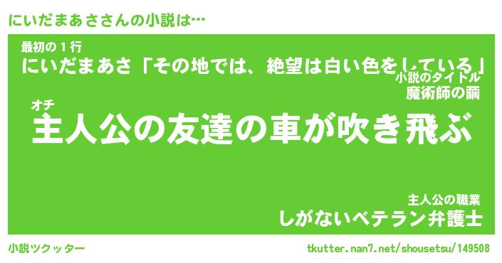 にいだまあささんの小説は… オチ『主人公の友達の車が吹き飛ぶ』最初の1行『にいだまあさ「その地では、絶望は白い色をしている」』主人公の職業『しがないベテラン弁護士』 ツクッター #小説ツクッター http://tkutter.nan7.net/shousetsu/149508/