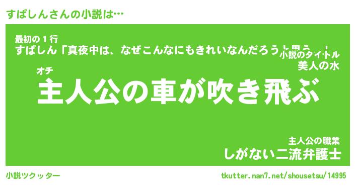 すぱしんさんの小説は… オチ『主人公の車が吹き飛ぶ』最初の1行『すぱしん「真夜中は、なぜこんなにもきれいなんだろうと思う。」』主人公の職業『しがない二流弁護士』 ツクッター #小説ツクッター http://tkutter.nan7.net/shousetsu/14995/