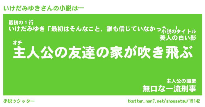 いけだみゆきさんの小説は… オチ『主人公の友達の家が吹き飛ぶ』最初の1行『いけだみゆき「最初はそんなこと、誰も信じていなかった。」』主人公の職業『無口な一流刑事』 ツクッター #小説ツクッター http://tkutter.nan7.net/shousetsu/15142/