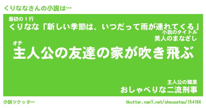 くりななさんの小説は… オチ『主人公の友達の家が吹き飛ぶ』最初の1行『くりなな「新しい季節は、いつだって雨が連れてくる」』主人公の職業『おしゃべりな二流刑事』 ツクッター #小説ツクッター http://tkutter.nan7.net/shousetsu/154166/