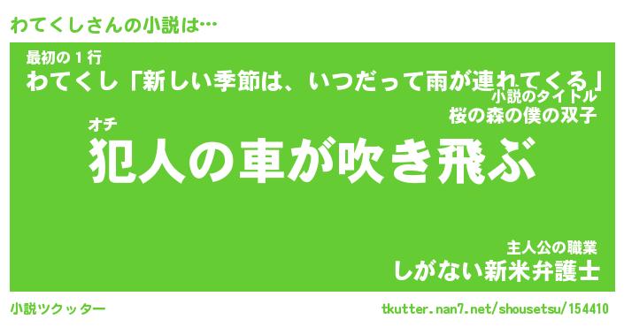 わてくしさんの小説は… オチ『犯人の車が吹き飛ぶ』最初の1行『わてくし「新しい季節は、いつだって雨が連れてくる」』主人公の職業『しがない新米弁護士』 ツクッター #小説ツクッター http://tkutter.nan7.net/shousetsu/154410/