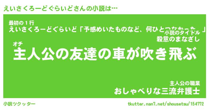 えいさくろーどぐらいどさんの小説は… オチ『主人公の友達の車が吹き飛ぶ』最初の1行『えいさくろーどぐらいど「予感めいたものなど、何ひとつなかった。」』主人公の職業『おしゃべりな三流弁護士』 ツクッター #小説ツクッター http://tkutter.nan7.net/shousetsu/154772/