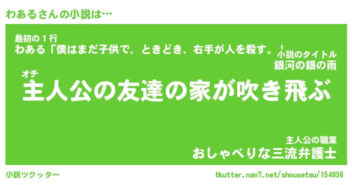 わあるさんの小説は… オチ『主人公の友達の家が吹き飛ぶ』最初の1行『わある「僕はまだ子供で、ときどき、右手が人を殺す。」』主人公の職業『おしゃべりな三流弁護士』 ツクッター #小説ツクッター http://tkutter.nan7.net/shousetsu/154836/