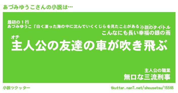 あづみゆうこさんの小説は… オチ『主人公の友達の車が吹き飛ぶ』最初の1行『あづみゆうこ「白く凍った海の中に沈んでいくくじらを見たことがあるだろうか。」』主人公の職業『無口な三流刑事』 ツクッター #小説ツクッター http://tkutter.nan7.net/shousetsu/15565/