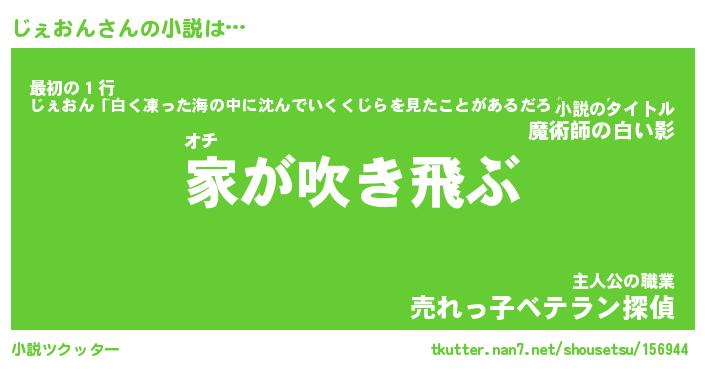 じぇおんさんの小説は… オチ『家が吹き飛ぶ』最初の1行『じぇおん「白く凍った海の中に沈んでいくくじらを見たことがあるだろうか。」』主人公の職業『売れっ子ベテラン探偵』 ツクッター #小説ツクッター http://tkutter.nan7.net/shousetsu/156944/