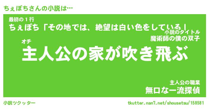 ちぇぽちさんの小説は… オチ『主人公の家が吹き飛ぶ』最初の1行『ちぇぽち「その地では、絶望は白い色をしている」』主人公の職業『無口な一流探偵』 ツクッター #小説ツクッター http://tkutter.nan7.net/shousetsu/158581/