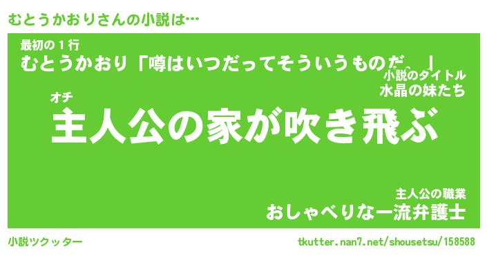 むとうかおりさんの小説は… オチ『主人公の家が吹き飛ぶ』最初の1行『むとうかおり「噂はいつだってそういうものだ。」』主人公の職業『おしゃべりな一流弁護士』 ツクッター #小説ツクッター http://tkutter.nan7.net/shousetsu/158588/