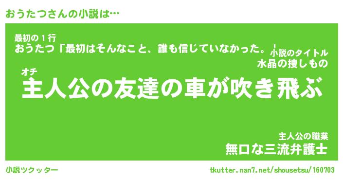 おうたつさんの小説は… オチ『主人公の友達の車が吹き飛ぶ』最初の1行『おうたつ「最初はそんなこと、誰も信じていなかった。」』主人公の職業『無口な三流弁護士』 ツクッター #小説ツクッター http://tkutter.nan7.net/shousetsu/160703/
