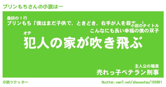 プリンもちさんの小説は… オチ『犯人の家が吹き飛ぶ』最初の1行『プリンもち「僕はまだ子供で、ときどき、右手が人を殺す。」』主人公の職業『売れっ子ベテラン刑事』 ツクッター #小説ツクッター http://tkutter.nan7.net/shousetsu/160861/