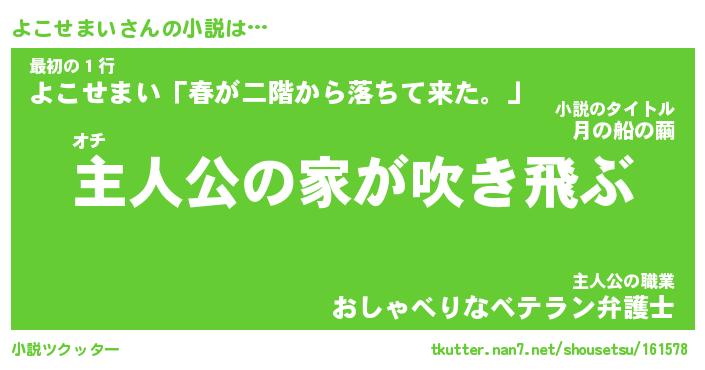 よこせまいさんの小説は… オチ『主人公の家が吹き飛ぶ』最初の1行『よこせまい「春が二階から落ちて来た。」』主人公の職業『おしゃべりなベテラン弁護士』 ツクッター #小説ツクッター http://tkutter.nan7.net/shousetsu/161578/