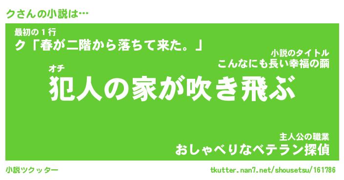 クさんの小説は… オチ『犯人の家が吹き飛ぶ』最初の1行『ク「春が二階から落ちて来た。」』主人公の職業『おしゃべりなベテラン探偵』 ツクッター #小説ツクッター http://tkutter.nan7.net/shousetsu/161786/