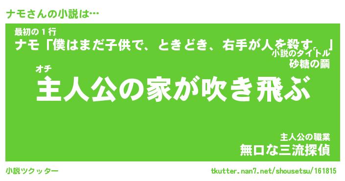 ナモさんの小説は… オチ『主人公の家が吹き飛ぶ』最初の1行『ナモ「僕はまだ子供で、ときどき、右手が人を殺す。」』主人公の職業『無口な三流探偵』 ツクッター #小説ツクッター http://tkutter.nan7.net/shousetsu/161815/
