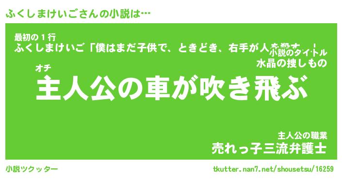 ふくしまけいごさんの小説は… オチ『主人公の車が吹き飛ぶ』最初の1行『ふくしまけいご「僕はまだ子供で、ときどき、右手が人を殺す。」』主人公の職業『売れっ子三流弁護士』 ツクッター #小説ツクッター http://tkutter.nan7.net/shousetsu/16259/