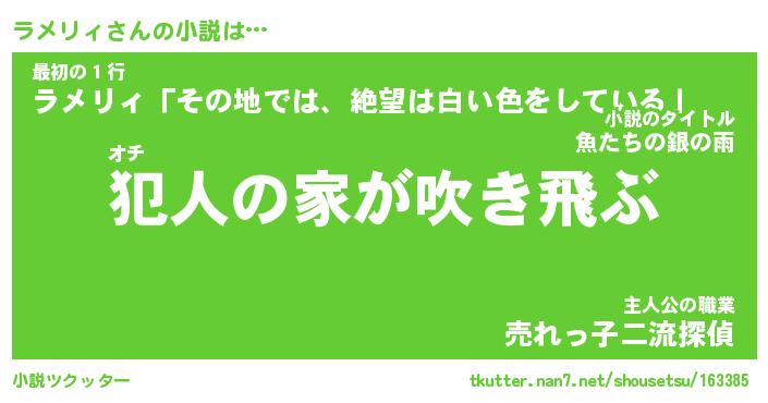 ラメリィさんの小説は… オチ『犯人の家が吹き飛ぶ』最初の1行『ラメリィ「その地では、絶望は白い色をしている」』主人公の職業『売れっ子二流探偵』 ツクッター #小説ツクッター http://tkutter.nan7.net/shousetsu/163385/
