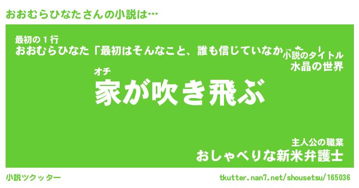 おおむらひなたさんの小説は… オチ『家が吹き飛ぶ』最初の1行『おおむらひなた「最初はそんなこと、誰も信じていなかった。」』主人公の職業『おしゃべりな新米弁護士』 ツクッター #小説ツクッター http://tkutter.nan7.net/shousetsu/165036/