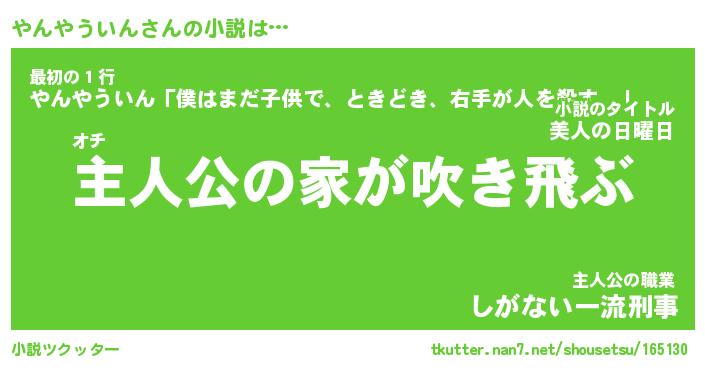 やんやういんさんの小説は… オチ『主人公の家が吹き飛ぶ』最初の1行『やんやういん「僕はまだ子供で、ときどき、右手が人を殺す。」』主人公の職業『しがない一流刑事』 ツクッター #小説ツクッター http://tkutter.nan7.net/shousetsu/165130/