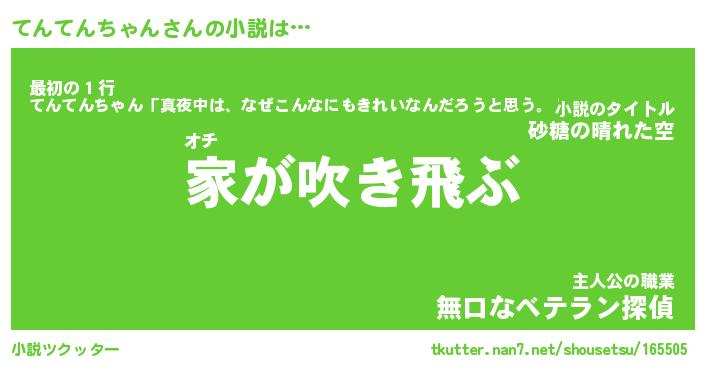 てんてんちゃんさんの小説は… オチ『家が吹き飛ぶ』最初の1行『てんてんちゃん「真夜中は、なぜこんなにもきれいなんだろうと思う。」』主人公の職業『無口なベテラン探偵』 ツクッター #小説ツクッター http://tkutter.nan7.net/shousetsu/165505/