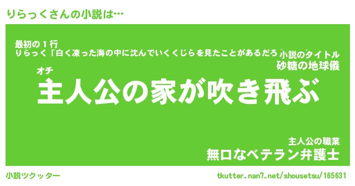 | 男性向けラノベタイトル風あだ名 | 『りらっくの憂鬱』 |