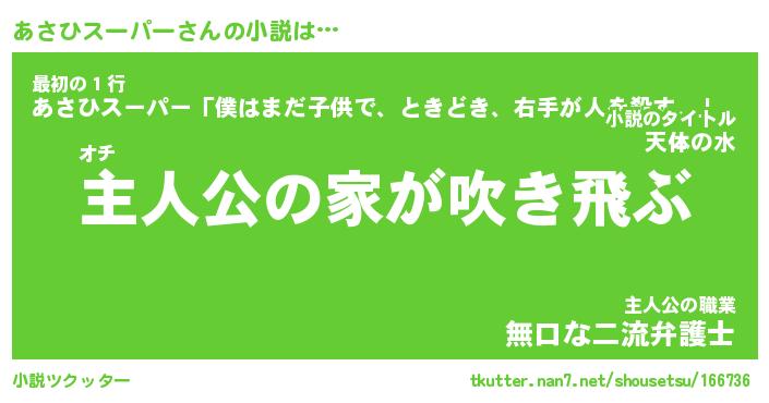 あさひスーパーさんの小説は… オチ『主人公の家が吹き飛ぶ』最初の1行『あさひスーパー「僕はまだ子供で、ときどき、右手が人を殺す。」』主人公の職業『無口な二流弁護士』 ツクッター #小説ツクッター http://tkutter.nan7.net/shousetsu/166736/