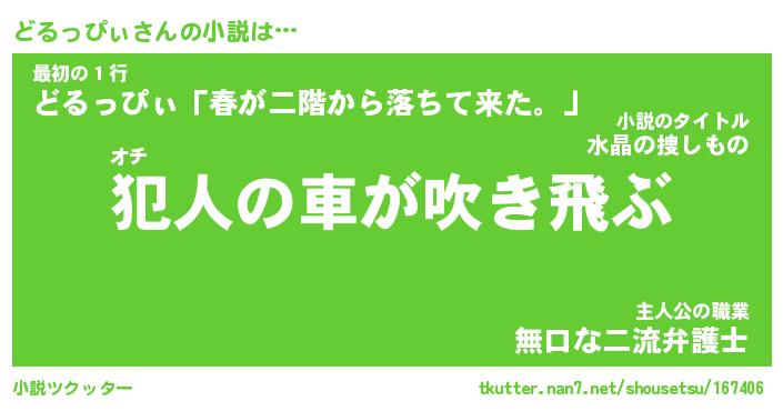 どるっぴぃさんの小説は… オチ『犯人の車が吹き飛ぶ』最初の1行『どるっぴぃ「春が二階から落ちて来た。」』主人公の職業『無口な二流弁護士』 ツクッター #小説ツクッター http://tkutter.nan7.net/shousetsu/167406/