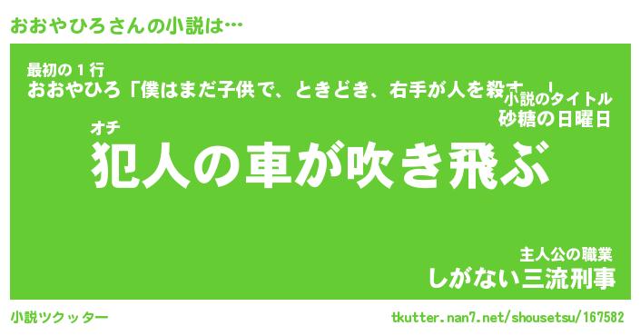 おおやひろさんの小説は… オチ『犯人の車が吹き飛ぶ』最初の1行『おおやひろ「僕はまだ子供で、ときどき、右手が人を殺す。」』主人公の職業『しがない三流刑事』 ツクッター #小説ツクッター http://tkutter.nan7.net/shousetsu/167582/