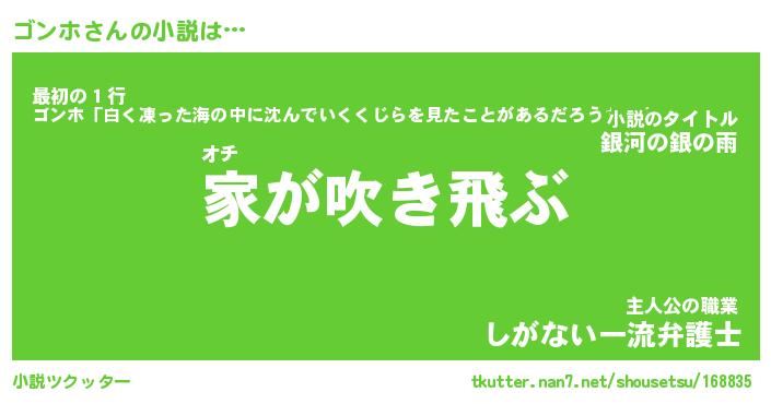 ゴンホさんの小説は… オチ『家が吹き飛ぶ』最初の1行『ゴンホ「白く凍った海の中に沈んでいくくじらを見たことがあるだろうか。」』主人公の職業『しがない一流弁護士』 ツクッター #小説ツクッター http://tkutter.nan7.net/shousetsu/168835/