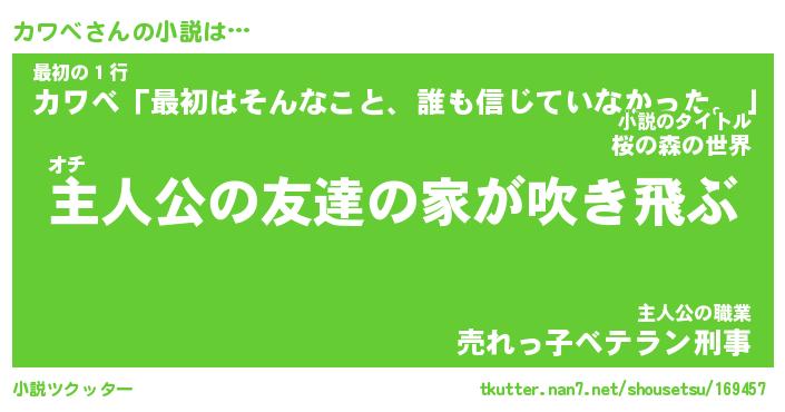 カワベさんの小説は… オチ『主人公の友達の家が吹き飛ぶ』最初の1行『カワベ「最初はそんなこと、誰も信じていなかった。」』主人公の職業『売れっ子ベテラン刑事』 ツクッター #小説ツクッター http://tkutter.nan7.net/shousetsu/169457/