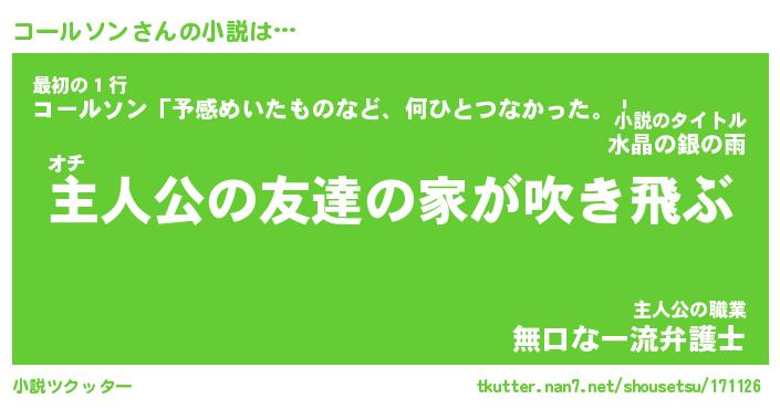 コールソンさんの小説は… オチ『主人公の友達の家が吹き飛ぶ』最初の1行『コールソン「予感めいたものなど、何ひとつなかった。」』主人公の職業『無口な一流弁護士』 ツクッター #小説ツクッター http://tkutter.nan7.net/shousetsu/171126/