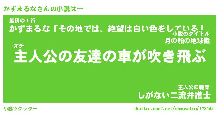 かずまるなさんの小説は… オチ『主人公の友達の車が吹き飛ぶ』最初の1行『かずまるな「その地では、絶望は白い色をしている」』主人公の職業『しがない二流弁護士』 ツクッター #小説ツクッター http://tkutter.nan7.net/shousetsu/173145/