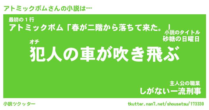 アトミックボムさんの小説は… オチ『犯人の車が吹き飛ぶ』最初の1行『アトミックボム「春が二階から落ちて来た。」』主人公の職業『しがない一流刑事』 ツクッター #小説ツクッター http://tkutter.nan7.net/shousetsu/173330/