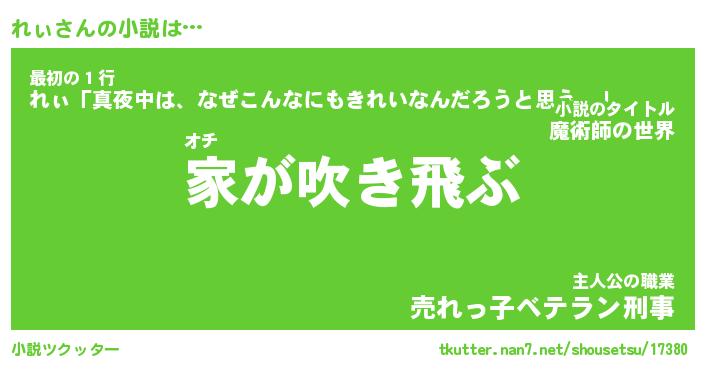 れぃさんの小説は… オチ『家が吹き飛ぶ』最初の1行『れぃ「真夜中は、なぜこんなにもきれいなんだろうと思う。」』主人公の職業『売れっ子ベテラン刑事』 ツクッター #小説ツクッター http://tkutter.nan7.net/shousetsu/17380/