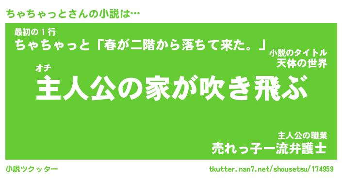 | 男性向けラノベタイトル風あだ名 | 『ちゃちゃっとの憂鬱』 |